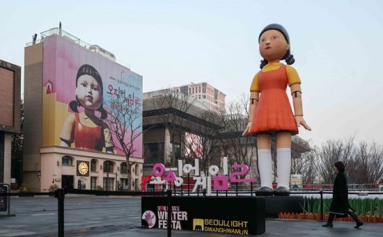 넷플릭스 오리지널시리즈 '오징어게임2'의 공개일인 26일 서울 종로구 광화문광장에 오징어게임 캐릭터 '영희' 조형물과 홍보 현수막이 설치돼 있다. 강진형 기자 |