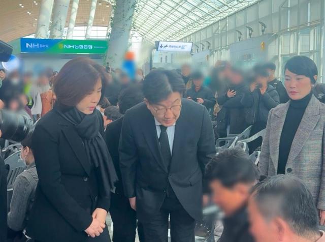 권성동 국민의힘 대표 권한대행 겸 원내대표가 30일 오전 전남 무안국제공항에서 제주항공 여객기 사고 희생자 유가족을 찾아가 위로하고 있다. 권 원내대표는 무안공항 일정을 마친 뒤 이날 오전 전남 무안군 양학리에 마련된 합동분향소에 조문 차 방문해 애도를 표했다. |