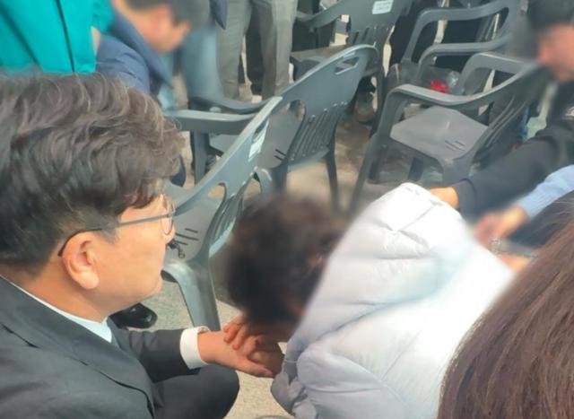 권성동 국민의힘 대표 권한대행 겸 원내대표가 30일 오전 전남 무안국제공항에서 제주항공 여객기 사고 희생자 유가족을 찾아가 위로하고 있다. 권 원내대표는 무안공항 일정을 마친 뒤 이날 오전 전남 무안군 양학리에 마련된 합동분향소에 방문해 조문했다. [사진=구동현 기자]