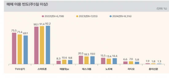 주 5일 이상 스마트폰을 이용하는 비율은 전년 대비 0.8%포인트 증가한 92.2%를 기록했다. 60세 이하는 주 5일간 스마트폰을 90% 이상 이용하며, 70세 이상은 64.4%가 이용한다고 응답했다.