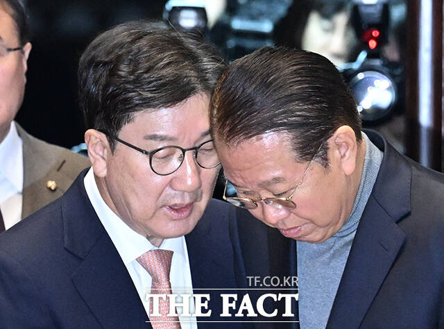 권영세 국민의힘 의원이 30일 당 비상대책위원장으로 임명됐다. 사진은 권성동 국민의힘 대표 권한대행 겸 원내대표(왼쪽)와 국민의힘 비상대책위원장에 지명된 권영세 의원이 26일 오전 서울 여의도 국회에서 열린 국민의힘 의원총회에 참석해 대화를 나누고 있는 모습. /박헌우 기자 |