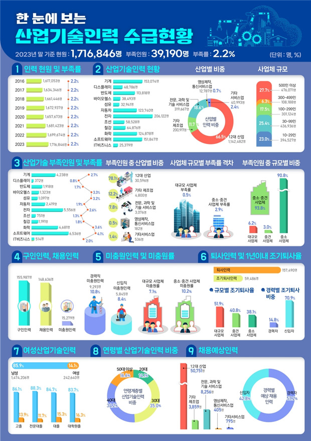 산업통상자원부는 31일 2024년도 산업기술인력 수급 실태조사 결과 발표를 통해 2023년 말 기준 산업기술인력이 전년 대비 1% 증가한 171만6846명으로 집계됐다고 밝혔다.