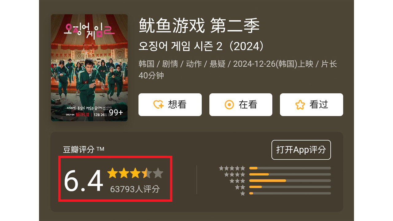현재 중국의 소셜미디어 플랫폼 더우반(豆瓣)에서 '오징어게임'시즌2'의 평점은 6.4점(10점 만점) 이며, 리뷰 개수는 약 6만 개 정도입니다.
