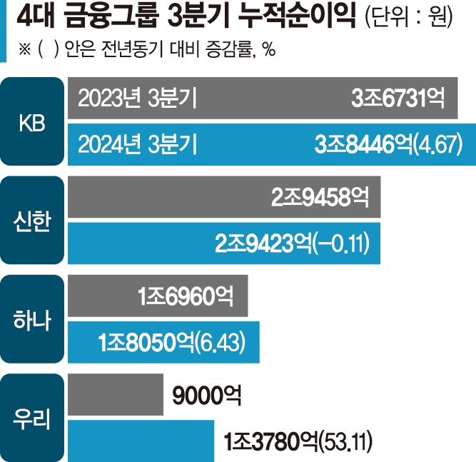 역대급 가계부채와 고금리 여파로 은행들은 지난해 역대 최고의 실적을 기록했다. 금융당국의 압박에 '일회성 비용'인 민생금융 지원에 4조원 이상을 돈을 푼 가운데서도 호실적을 냈다. 지난해 3·4분기까지 4대 금융그룹이 거둔 순이익만 모두 14조2653억원에 이른다. 전년동기(13조6107억원)보다 4.8% 늘었다.