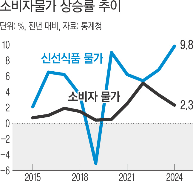 2024년 이상기후로 인해 과일과 채소 등 신선식품 물가가 크게 오르며 14년 만에 가장 높은 상승률을 기록했다. 전체 소비자물가 상승률은 2%대 초중반으로 전년보다 둔화 흐름을 보였지만, 최근 고환율 영향으로 당분간 물가 상승 압력이 커질 것이란 전망이 나온다.