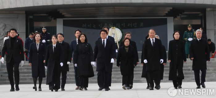 [서울=뉴스핌] 양윤모 기자 = 황운하 조국혁신당 원내대표와 국회의원들이 2025년 을사년(乙巳年) 첫날인 1일 오전 서울 동작구 국립서울현충원을 찾아 현충탑 참배를 마치고 이동하고 있다. 2025.01.01 yym58@newspim.com