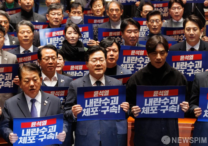 [서울=뉴스핌] 윤창빈 기자 = 박찬대 더불어민주당 원내대표를 비롯한 소속 의원들이 2일 오후 서울 여의도 국회에서 열린 비상의원총회에서 윤석열 대통령의 체포를 촉구하는 피켓팅을 하고 있다. 2025.01.02 pangbin@newspim.com