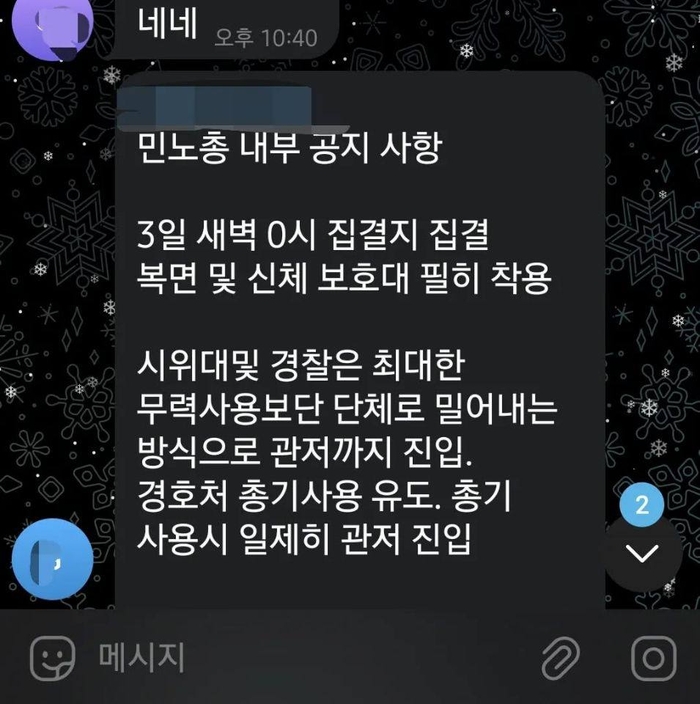앞서 일부 극우 커뮤니티 등에서는 ‘민노총 내부 공지 사항’이라는 메시지가 포함된 카카오톡 대화 화면 캡처가 돌았다. 메시지에는 “3일 새벽 0시 집결지 집결, 복면 및 신체 보호대 필히 착용” “경호처 총기사용 유도, 총기 사용 시 일제히 관저 진입” 등이 적혀 있다.