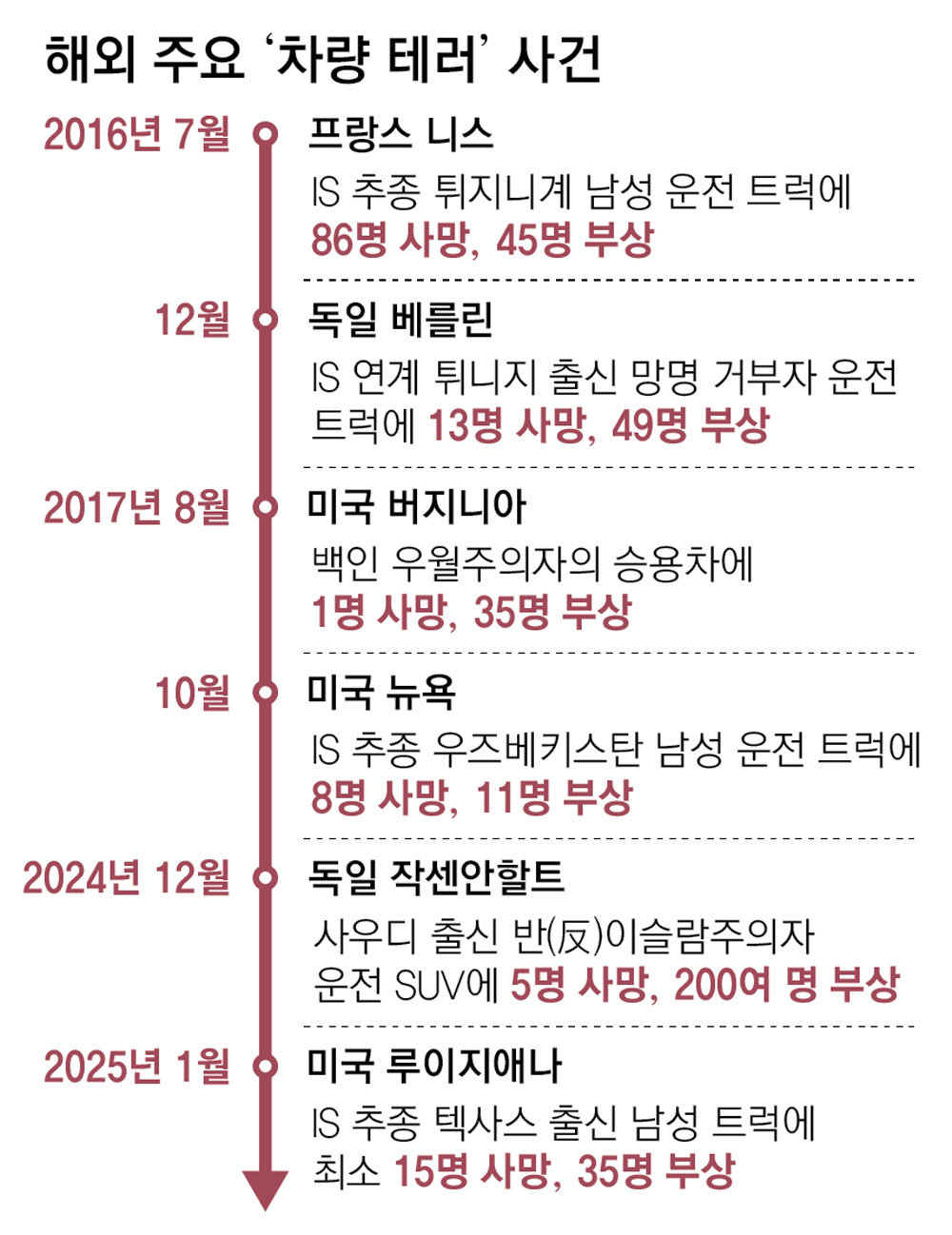 실제로 최근 차량 테러는 계속 늘어나는 추세다. 미국 새너제이주립대 미네타 교통연구소(MTI)에 따르면 1963∼2019년 의도적으로 차량을 돌진시켜 인명 피해를 일으킨 사건(총 184건)의 70%가 2014년 이후 발생했다. 2016년 차량 테러를 독려하는 지침을 내린 IS는 2014∼2017년 전 세계에서 17건의 차량 테러를 일으켜 173명을 살해했다. 반(反)이슬람주의 테러에도 차량이 동원됐다. 지난해 12월 독일 마그데부르크에서 열린 성탄 시장에서는 사우디아라비아 출신 남성이 스포츠유틸리티차량(SUV)으로 군중을 들이받아 5명이 숨지고 200명 이상이 다쳤다.