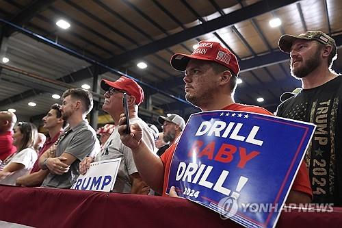 트럼프 대선유세때 시추확대 공약 적은 패널 든 지지자 |