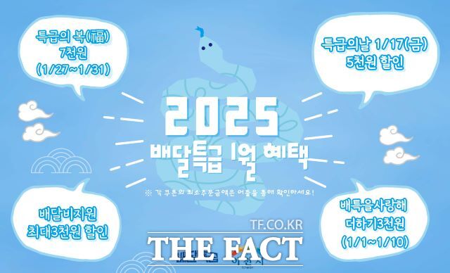 주요 이벤트 내용은 △1월 1~10일 배특을사(乙巳)랑해 더하기 3000원 쿠폰 △금요일(17일) ‘특급의 날’ 5000원 쿠폰 △1월 27~31일 특급 복(福)이벤트 7000원 쿠폰 △매일 1인 1회 배달비 3000원 쿠폰 등이다.