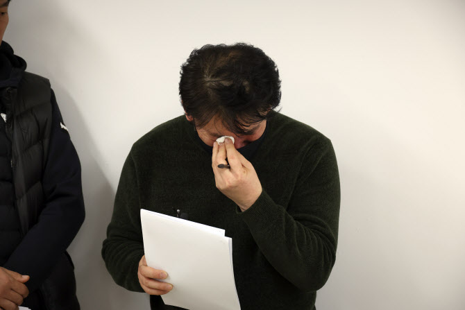 박한신 유가족협의회 대표가 지난 2일 전남 무안국제공항에 마련된 제주항공 여객기 참사 희생자 합동분향소에서 기자회견 도중 눈물을 흘리고 있다. (사진=연합뉴스) |