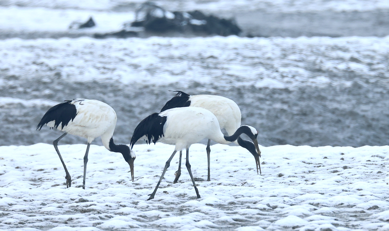 소한인 5일 오후 인천 강화군 동검도 인근 갯벌에서 겨울을 나고 있는 두루미들이 눈 덮인 갯벌에서 먹이활동을 하고 있다. 천연기념물인 두루미는 매년 겨울 강화 갯벌을 찾아와 겨울을 보낸 뒤 번식지인 시베리아로 이동한다. [연합] |