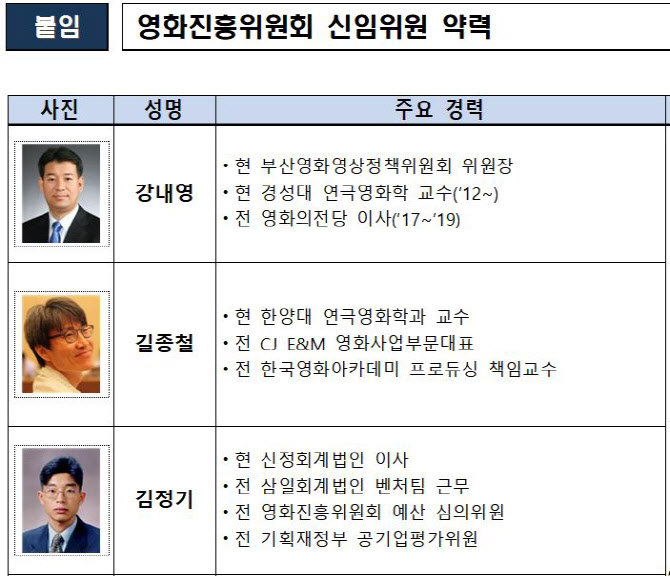 문체부는 “신임 위원 모두 영화계 각 분야에서 활발하게 활동해 온 전문가들”이라며 “영화 관련 단체의 후보자 추천 등을 거쳐 영화예술, 영화산업 등에서의 전문성과 식견, 학계와 현장에서의 경험, 성(性)과 나이 등 다양한 요소들을 균형 있게 고려해 신임 위원을 임명했다”고 전했다.