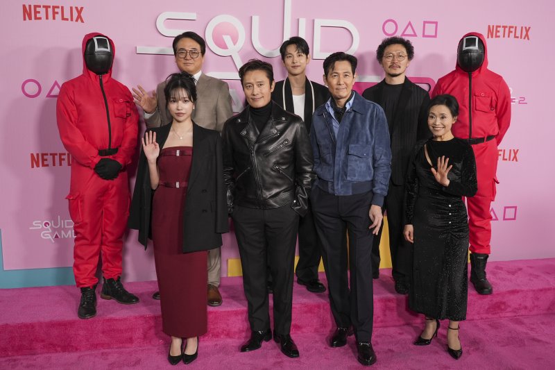 [로스앤젤레스=AP/뉴시스] 오징어 게임 시즌2 출연진이 12일(현지시각) 미 캘리포니아주 로스앤젤레스의 시티 칼리지에서 열린 '오징어 게임' 시즌 2 시사회장에 도착해 기념 촬영하고 있다. |