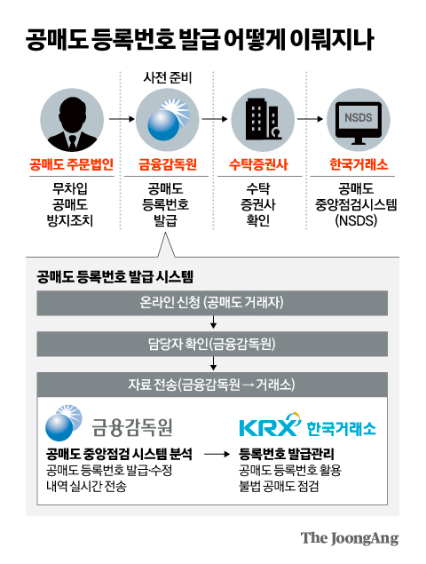 등록번호는 공매도 전산시스템이 법인에 부여하는 일종의 ‘ID’다. 이후 공매도 거래를 관리하는 중앙점검시스템(NSDS)은 이 등록번호를 기반으로 무차입 공매도 거래를 실시간으로 탐지한다. 공매도를 하는 법인이 여러 증권사나 계좌를 이용해도, 해당 등록번호별로 거래 내용을 모두 집계해 무차입 공매도 여부를 판별할 수 있다.