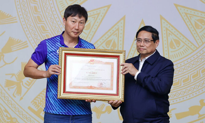 동남아 최대 축구 대회 2024 미쓰비시일렉트릭컵에서 우승한 베트남 축구대표팀의 김상식 감독이 6일(현지시간) 베트남 하노이 정부 청사에서 팜 민 찐 총리(오른쪽)에게 1급 노동훈장을 받고 있다. 베트남축구협회 페이스북 캡처 |
