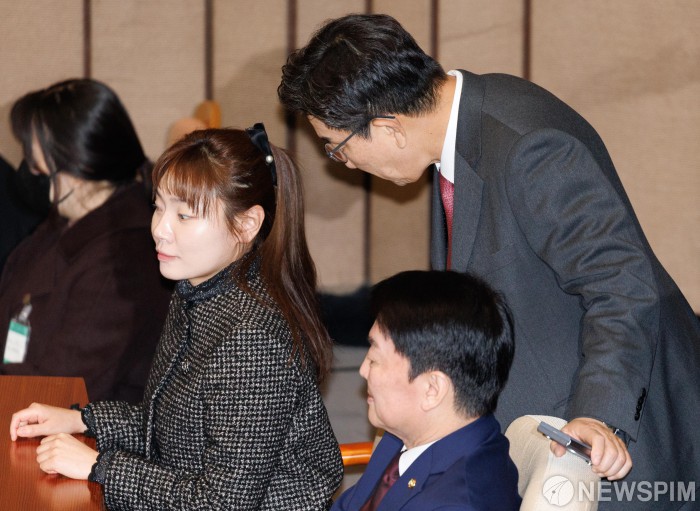 [서울=뉴스핌] 윤창빈 기자 = 권성동 국민의힘 원내대표, 김예지 의원이 8일 오후 서울 여의도 국회에서 열린 본회의에서 대화를 나누고 있다. 2025.01.08 pangbin@newspim.com