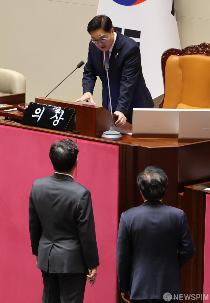 [서울=뉴스핌] 윤창빈 기자 = 권성동 국민의힘 원내대표가 8일 오후 서울 여의도 국회에서 열린 본회의에서 쌍특검법 등 재의된 8개 법안이 모두 부결되자 회의장 떠난 더불어민주당 의원들에 대해 우원식 국회의장에게 항의하고 있다. 2025.01.08 pangbin@newspim.com