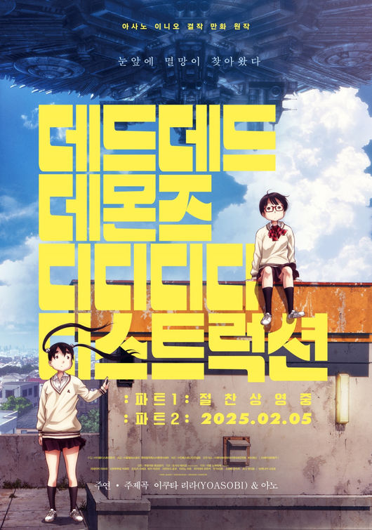 이날 개봉한 '데데디디:파트1'은 SF 청춘 블록버스터에 멸망을 곁들인 소재로 일본을 넘어 전 세계 만화 마니아들이 푹 빠진 마성의 디스토피아 청춘 애니메이션이다. 이 후속편 '데데디디: 파트2'가 오는 2월 5일 개봉을 확정한 것. '데데디디: 파트2'는 모함의 이상으로 순식간에 멸망을 향해 급발진하는 지구, 마지막 순간까지 서로의 손을 잡은 두 소녀의 청춘 애니메이션을 그린다.