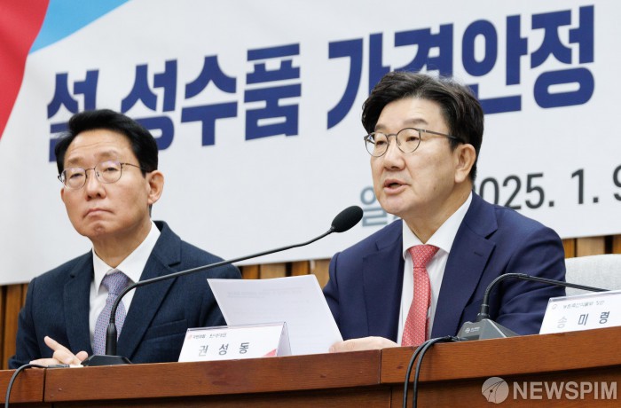 [서울=뉴스핌] 윤창빈 기자 = 권성동 국민의힘 원내대표가 9일 오전 서울 여의도 국회에서 열린 설 성수품 가격안정 및 소비진작을 위한 당정협의회에서 모두발언을 하고 있다. 2025.01.09 pangbin@newspim.com