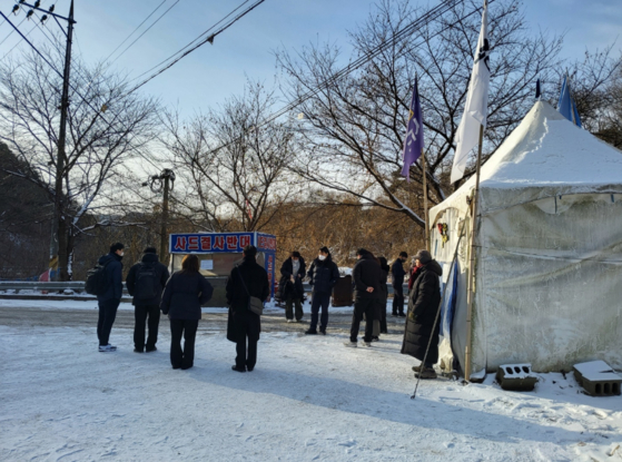 오늘(9일) 오전 서울중앙지검이 경북 성주군 소성리 마을회관 인근 사드기지 반대 집회 장소인 원불교 진밭평화교당 천막에서 압수수색을 벌이고 있다. 〈사진=사드 철회 소성리 종합상황실, 연합뉴스〉 |