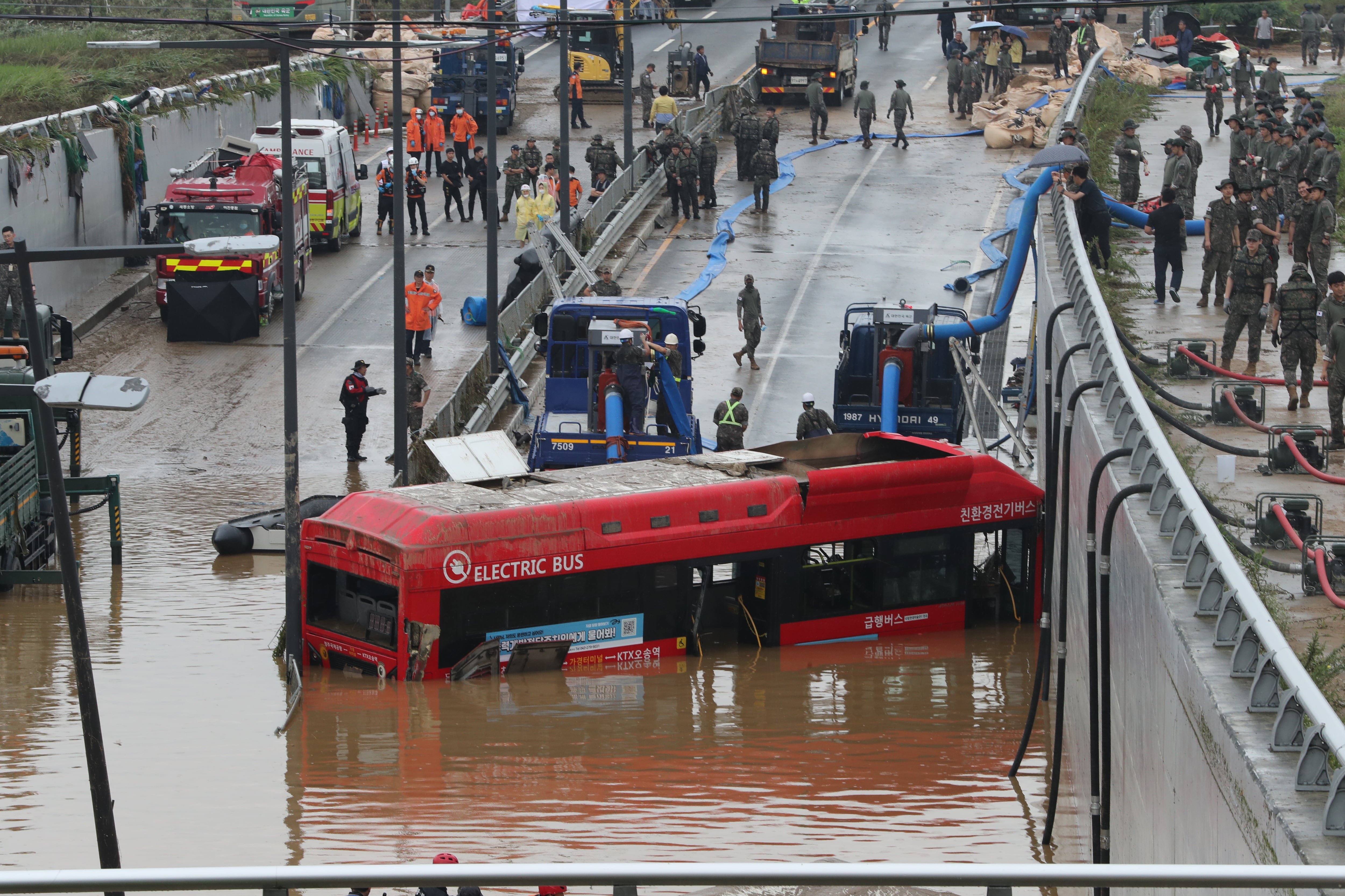 2023년 7월 16일 미호천 제방 유실로 침수된 충북 청주시 오송읍 궁평2지하차도에서 소방당국이 구조작업을 진행하고 있다. /뉴스1 |