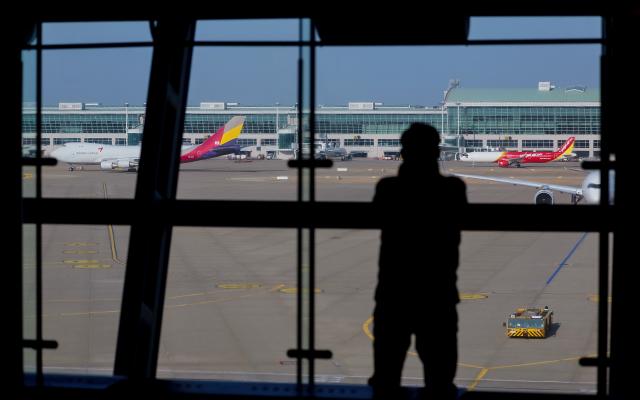 7일 인천국제공항 제1여객터미널에서 한 시민이 주기장을 이동하는 비행기를 바라보고 있다. [사진=연합뉴스] |