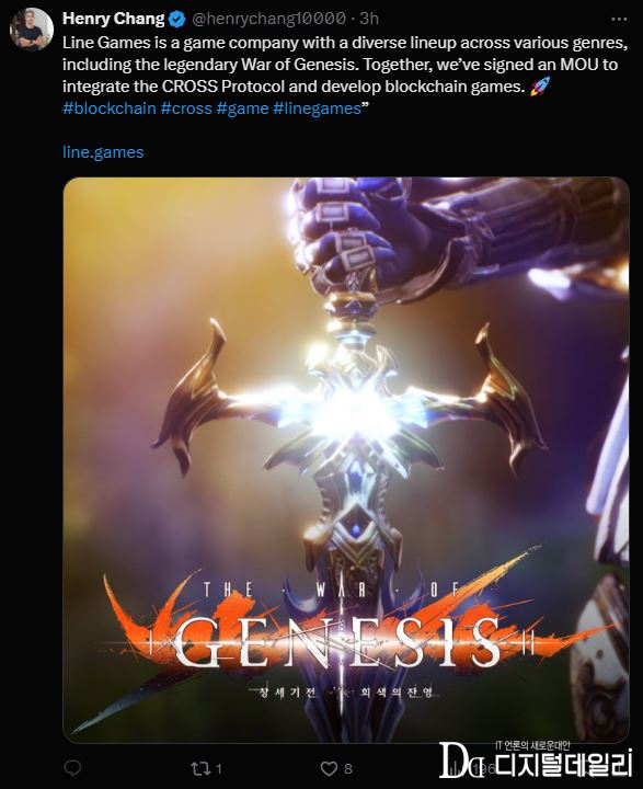 장 대표는 10일 자신의 엑스(X·옛 트위터) 계정을 통해 이같은 소식을 전했다. 그는 “라인게임즈는 전설적인 ‘창세기전’ 시리즈를 비롯해 다양한 장르의 라인업을 가진 게임사”라며 “블록체인 게임을 개발하고 ‘크로스(CROSS)’ 프로토콜에 통합하기로 MOU를 맺었다”고 밝혔다.