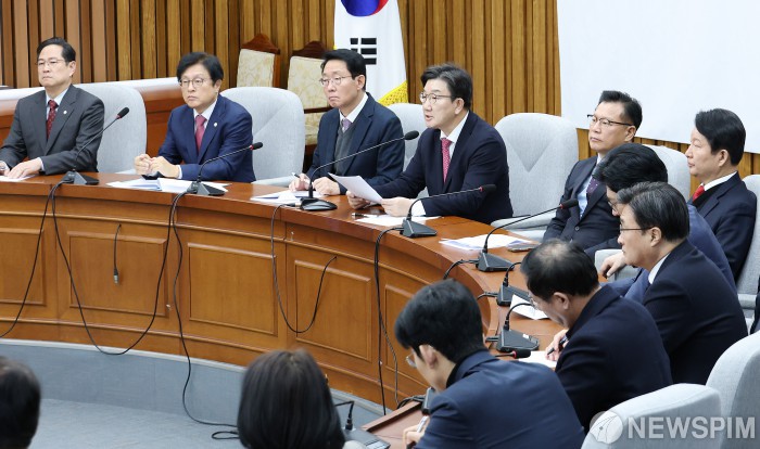 [서울=뉴스핌] 정일구 기자 = 권성동 국민의힘 원내대표가 10일 오전 서울 여의도 국회에서 열린 원내대책회의에서 모두발언을 하고 있다. 2025.01.10 mironj19@newspim.com