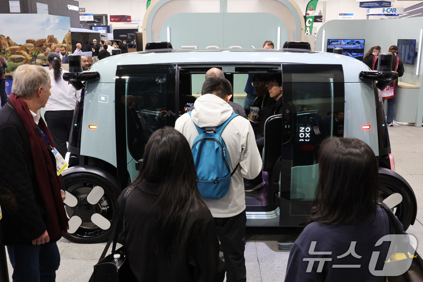 (라스베이거스(미국)=뉴스1) 신웅수 기자 = 세계 최대 IT(정보기술)·가전 전시회 'CES 2025' 폐막을 하루 앞둔 9일(현지시간) 미국 네바다주 라스베이거스 컨벤션센터(LVCC)에 마련된 죽스(ZOOX) 전시관에서 관람객들이 자율주행 택시를 살펴보고 있다. 2026.1.10/뉴스1