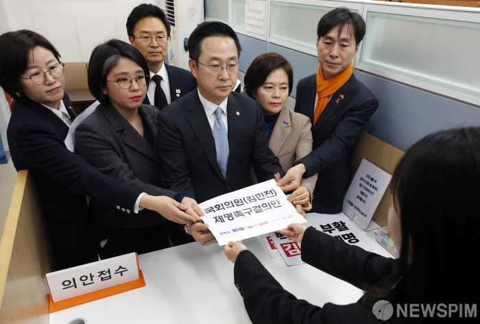 더불어민주당 박성준 원내수석부대표와 정진욱 의원, 정춘생 조국혁신당 의원, 정혜경 진보당 의원, 용혜인 기본소득당 대표, 한창민 사회민주당 대표가 10일 서울 여의도 국회 의안과에서 김민전 국민의힘 의원 제명촉구 결의안을 제출하고 있다. 2025.01.10.