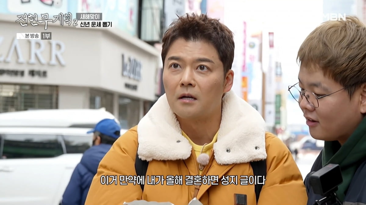 이날 전현무는 대전에 도착하자마자 신년운세를 뽑았다. '결혼할 수 있는 운입니다'라는 점괘에 곽튜브는 "형 올해 결혼할 생각 있냐"고 물었다. 이에 전현무는 "좋은 사람이 있다면 한다"고 답했다.