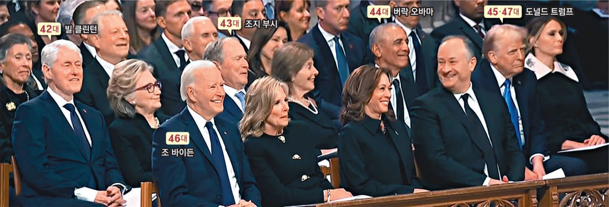 9일(현지 시간) 미국 워싱턴 국립대성당에서 열린 지미 카터 전 대통령의 장례식에 전현직 대통령 5명이 모두 참석했다. 카터 전 대통령의 전임자 겸 정적 제럴드 포드 전 대통령이 생전 작성한 추도사를 이날 포드 전 대통령의 아들 스티븐이 대독했다. 5명의 전현직 대통령이 이 추도사를 들으며 미소 짓고 있다. 공화당 소속으로 공식 석상에서 붉은 넥타이를 즐겨 매는 도널드 트럼프 대통령 당선인은 카터 전 대통령에 대한 예우 차원에서 민주당의 상징색인 파란 넥타이를 맸다.