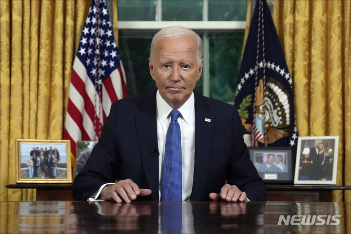 [워싱턴=AP/뉴시스] 조 바이든 미국 대통령이 지난해 7월24일(현지시각) 백악관 집무실에서 대국민 연설을 하고 있다. 바이든 대통령은 오는 15일 퇴임 고별연설을 할 예정이다. 2025.1.11. |