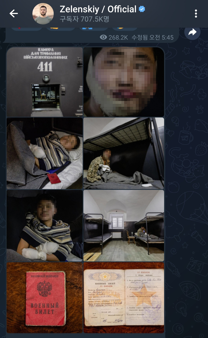 젤렌스키 대통령은 11일 자신의 텔레그램 채널에 생포한 북한군 2명의 얼굴과 부상 상태 등이 드러나는 사진 4장과 신분증 사진 2장을 공개했다. 또 “(북한군 포로를 수감 중인) 우크라이나 보안국에 언론인들이 이 수감자들과 접촉할 수 있도록 허용하라고 지시했다”며 “세상은 무슨 일이 일어나고 있는지 알아야 한다”고 밝혔다.