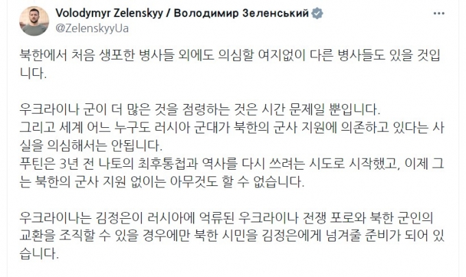 12일(현지시간) 젤렌스키 대통령은 SNS 'X'(옛 트위터)에 한글로 "김정은이 러시아에 억류된 우크라이나 전쟁 포로와 북한 군인의 교환을 추진할 경우 북한 군인을 김정은에게 넘겨줄 준비가 돼 있다"며 "우크라이나가 생포하는 북한 병사들이 앞으로 더 늘어날 것이 틀림없다"고 썼다.