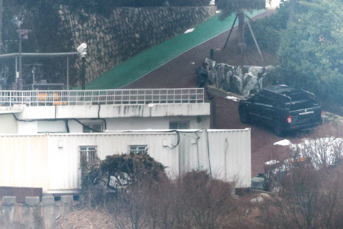 13일 오전 서울 용산구 한남동 대통령 관저에서 경호처 대테러과 직원으로 보이는 인물이 순찰하고 있다. (사진=연합뉴스) |