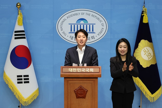 이준석 개혁신당 의원이 오늘(13일) 서울 여의도 국회 소통관에서 더불어민주당의 '민주파출소'의 불법성을 지적하며 철거를 촉구했다. 〈사진=연합뉴스〉 |