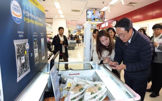 강도형 해양수산부 장관이 19일 서울 용산구 이마트 용산점에 마련된 수산물 이력제 홍보 부스에서 스마트폰을 이용해 수산물 이력을 조회하고 있다. 해수부는 김장철 수산물 소비를 촉진하고 국민 장바구니 부담을 완화하기 위해 온·오프라인 유통업체와 함께 '대한민국 수산대전-코리아 수산페스타' 행사를 진행하고 있다. 조용준 기자 |