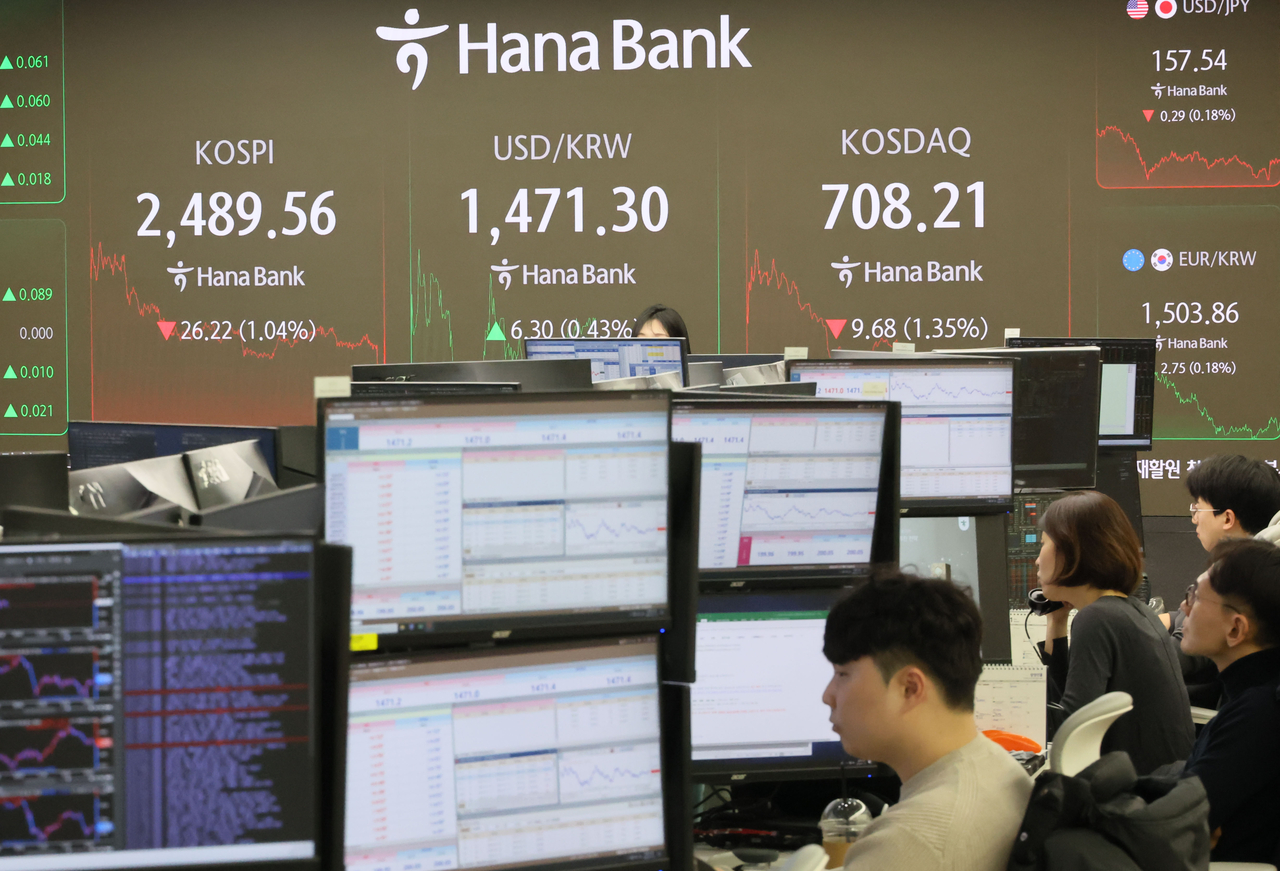 13일 서울 중구 하나은행 본점 딜링룸 현황판에 코스피와 원/달러 환율 등 지수들이 표시되고 있다. 이날 코스피 지수는 전 거래일보다 26.22포인트(1.04%) 내린 2,489.56, 코스닥 지수는 전장 대비 9.68포인트(1.35%) 내린 708.21로 마쳤다. 원/달러 환율은 5.8원 오른 1,470.8원에 주간 거래를 마쳤다. [연합] |