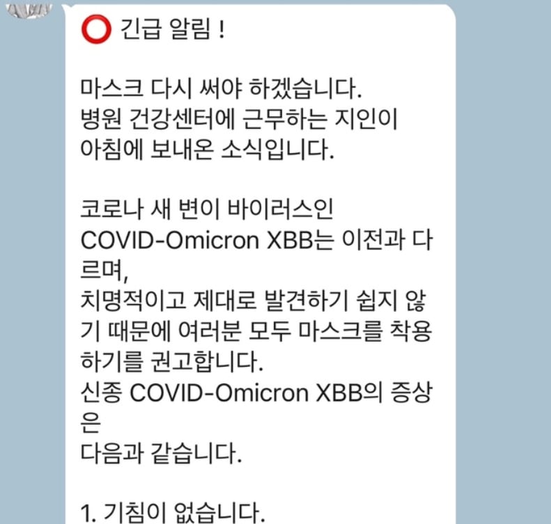 메시지에는 “긴급 알림”이라는 표현과 함께 “병원 건강센터에 근무하는 지인이 아침에 보내온 소식”이라며 “코로나 새 변이 바이러스인 XBB는 이전과 다르며, 치명적이고 제대로 발견하기 쉽지 않기 때문에 여러분 모두 마스크를 착용하기를 권고한다”는 내용이 담겼다. 작성자는 새 변이 바이러스 증상으로 “기침이 없다” “열이 나지 않는다” “관절통, 두통, 목 통증, 허리 상부의 통증, 폐렴, 전반적인 식욕 저하” 등을 언급하며 “XBB는 델타 변이보다 5배 독성이 강하고 사망률이 높다”고 주장했다.