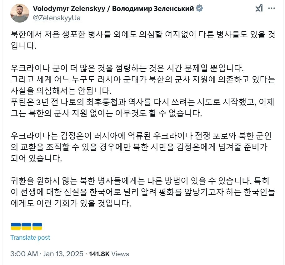 젤렌스키 대통령은 13일(현지 시간) 소셜미디어 X에 한글로 “김정은(북한 국무위원장)이 러시아에 억류된 우크라이나 전쟁 포로와 북한 군인의 교환을 추진할 경우에만 북한 군인을 김정은에게 넘겨줄 준비가 돼 있다”고 밝혔다. 그는 “처음 생포한 (북한) 병사들 외에도 의심할 여지없이 다른 병사들도 있을 것”이라고 덧붙였다. 앞으로 북한군 포로가 늘어날 가능성이 높다는 것을 언급한 것으로 해석된다.