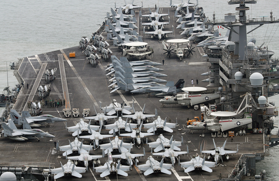 미국 핵추진 항공모함 '시어도어 루스벨트'(CVN-71). 지난해 6월 한국·미국·일본 3국의 최초 다영역 군사훈련인 '프리덤 에지'(Freedom Edge)에 참가하기 위해 부산 남구 해군작전사령부 부산작전기지에서 출항하는 모습. 뉴스1 |