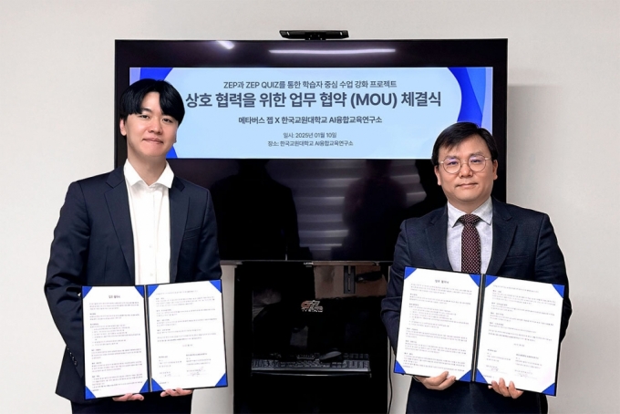 메타버스 플랫폼 기업 젭(ZEP)은 한국교원대 AI(인공지능) 융합교육연구소와 메타버스 기반 AI·소프트웨어 교육 생태계 구축을 위한 업무협약(MOU)을 체결했다고 14일 밝혔다.
