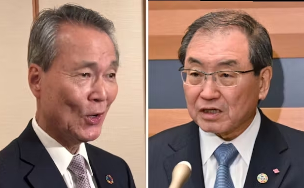 차기 게이단렌 회장으로 내정된 쓰쓰이 요시노부 부회장(왼쪽)과 도쿠라 마사카즈 현 회장. 니혼게이자이신문 제공 |