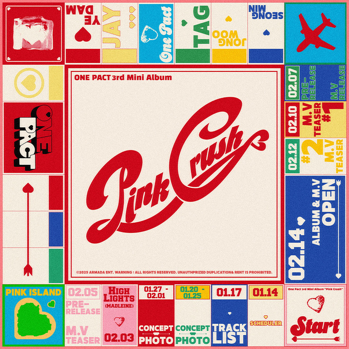 14일 ONE PACT의 소속사 아르마다이엔티는 밤 12시 공식 SNS 채널을 통해 3rd Mini Album 'PINK CRUSH' 스케줄러를 공개하고, 오는 2월 14일 정오 발매를 공식화했다.