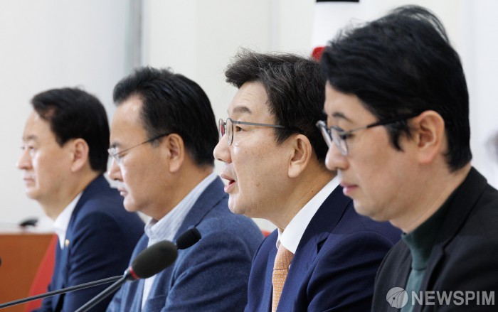 [서울=뉴스핌] 윤창빈 기자 = 권성동 국민의힘 원내대표가 14일 오후 서울 여의도 국회에서 비상계엄 특검법 발의 관련 기자회견을 하고 있다. 2025.01.14 pangbin@newspim.com