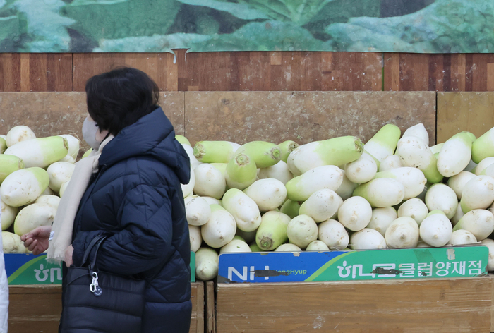 서울에 있는 한 대형마트 채소코너에 김장용 무가 쌓여있다. 연합뉴스 |
