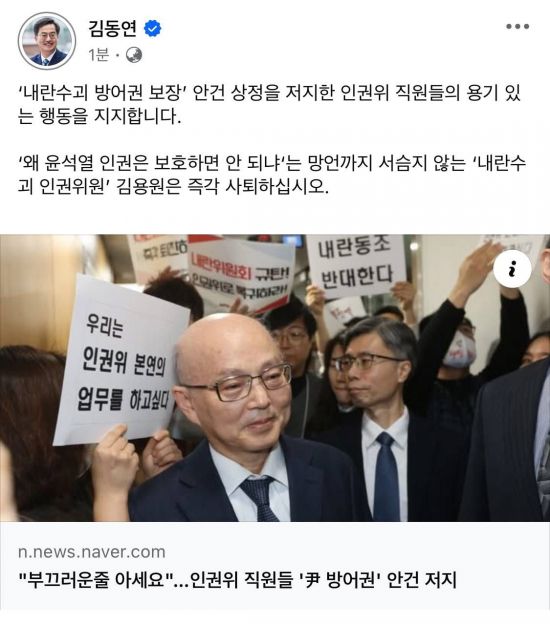 김동연 지사는 14일 자신의 사회관계망서비스(SNS)에 올린 글에서 "‘내란수괴 방어권 보장’ 안건 상정을 저지한 인권위 직원들의 용기 있는 행동을 지지한다"며 "‘왜 윤석열 인권은 보호하면 안 되냐’는 망언까지 서슴지 않는 ‘내란수괴 인권위원’ 김용원은 즉각 사퇴하라"고 압박했다.